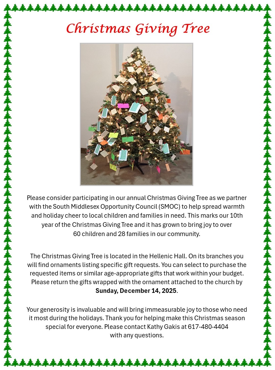 Please consider participating in our annual Christmas Giving Tree as we partner with the South Middlesex Opportunity Council (SMOC) to help spread warmth and holiday cheer to local children and families in need.